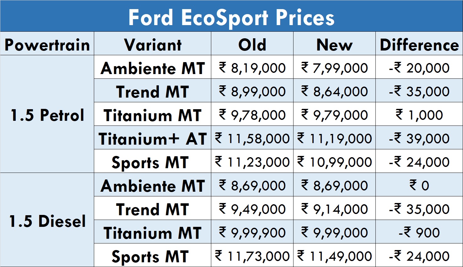 Ford continues to surprise. First, it called-off the formation of a joint venture with Mahindra. And now, it has introduced the 2021 EcoSport range. If you think the latter isn’t surprising at all, allow us to explain. In December last year, Ford joined the long list of carmakers who announced a price hike for their offerings from January 2021. The 2021 EcoSport has actually gotten more affordable. Here, check out the price list: