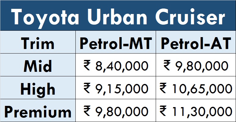 Say hello to Toyota-Suzuki’s second love-child for India – the Urban Cruiser. With prices ranging between Rs 8.4 lakh and Rs 11.3 lakh, it arrives to crowd the already crowded subcompact SUV space further. The rebadged and mildly-restyled Vitara Brezza is available in six variants, covering three trim levels, two transmission options and one engine. Here’s how the complete price list looks like: