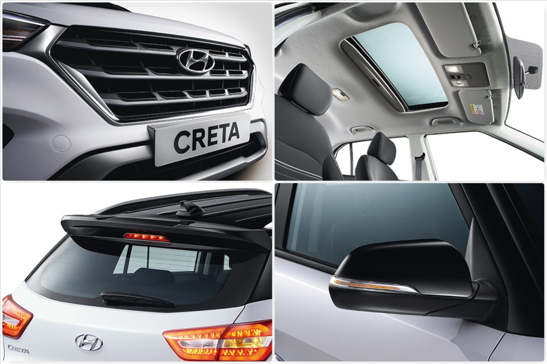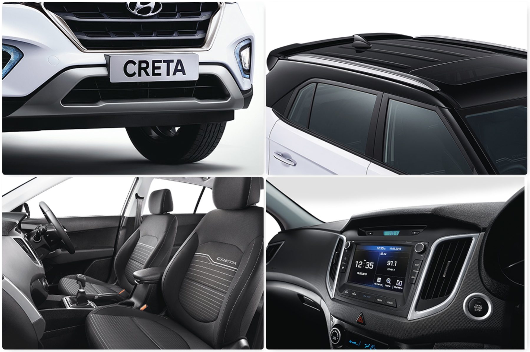 Changes inside the cabin include black seat fabric with Creta embossing, contrast stitching in the boot area, a leather-wrapped steering wheel and silver accents on the AC vents, inside door handles, console upper cover and the steering wheel. As far as exterior cosmetic upgrades are concerned, the SUV gets smoked headlamp enclosures, black ORVMs, a rear spoiler, faux dual exhaust outlets finished in chrome, front grille finished in black and dark chrome, and silver-coloured front and rear skid plates as well as roof rails.