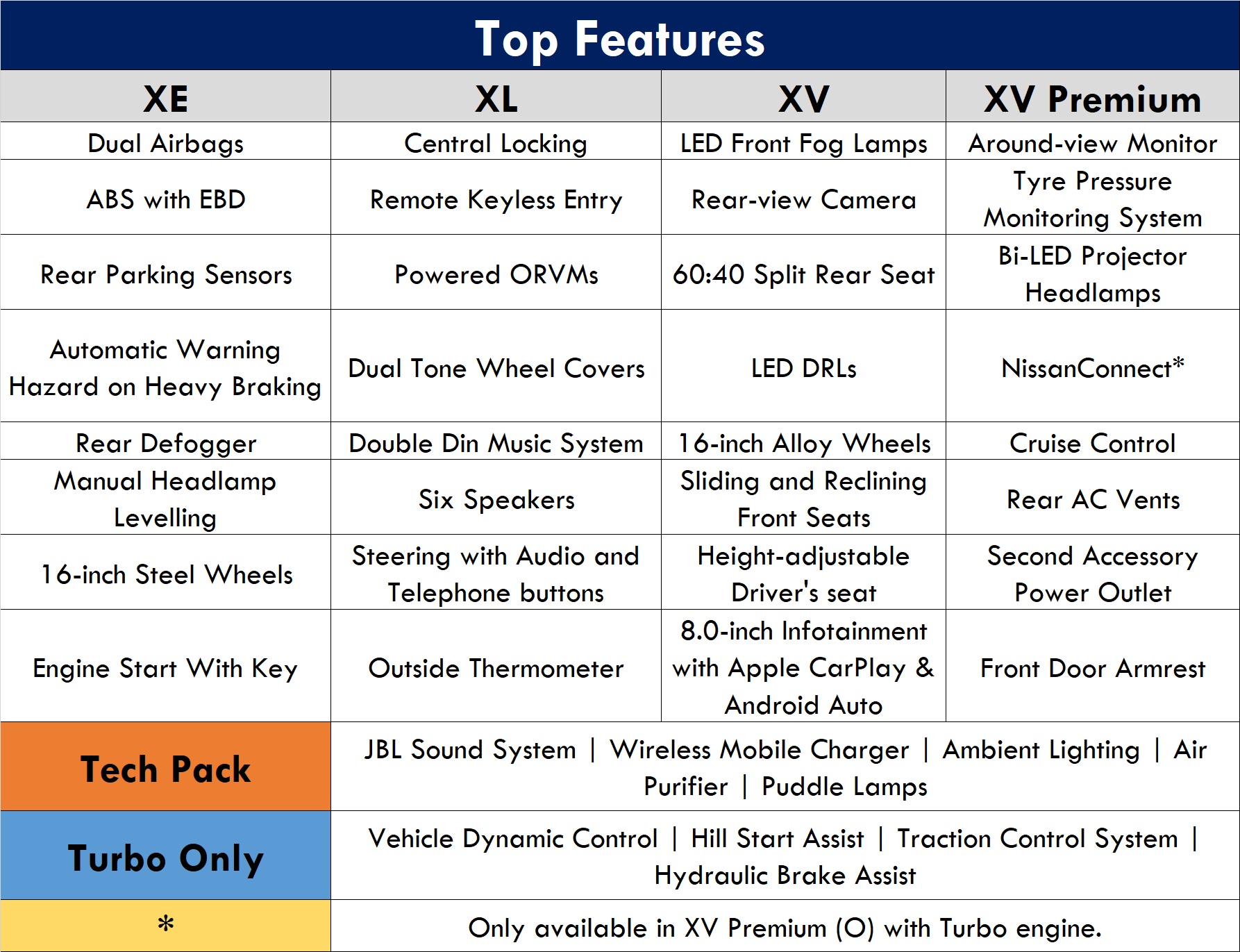 Nissan has devised a total of twenty derivatives of the Magnite. They cover four primary trim levels and three engine-transmission combinations. Here’s a table that encapsulates all: