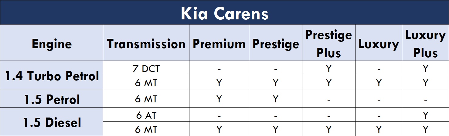 There are five primary trims – Premium, Prestige, Prestige Plus, Luxury and Luxury Plus. As standard, the Carens will have a seven-seat layout. And, only the range-topping trim – Luxury Plus – offers the choice between six- and seven-seat configurations. Here’s how the variants line-up looks like: